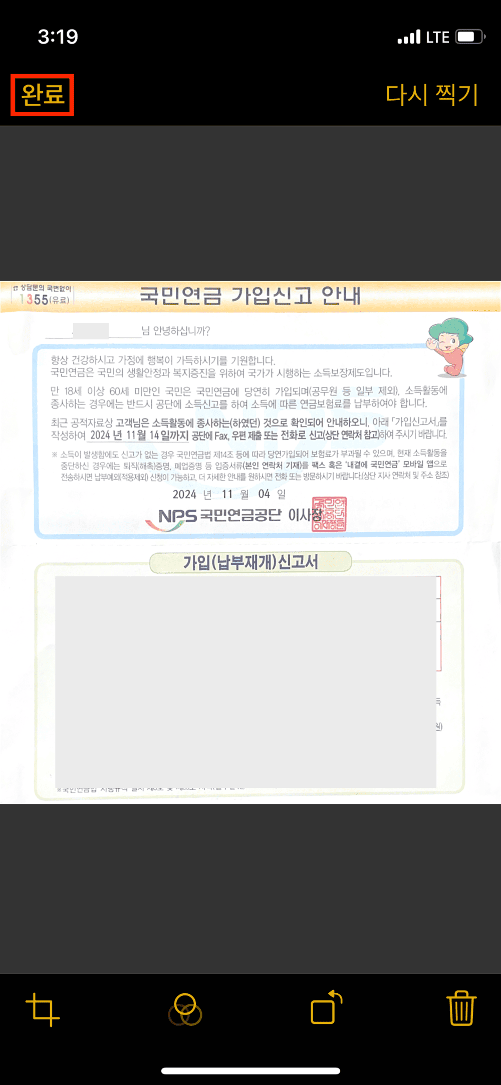 화면에 맞추어 사진을 찍으면 자동으로 문서 크기에 맞춰서 스캔을 해주는데요. 모서리 부분 어긋남 등 미세한 부분을 살짝만 잡아준 뒤 '완료'를 누르면 스캔된 이미지가 사진 앨범에 저장됩니다. 만약 스캔된 사진이 흐릿하다거나 마음에 들지 않는다면 오른쪽 상단의 '다시 찍기' 버튼을 눌러 다시 촬영해 주세요!