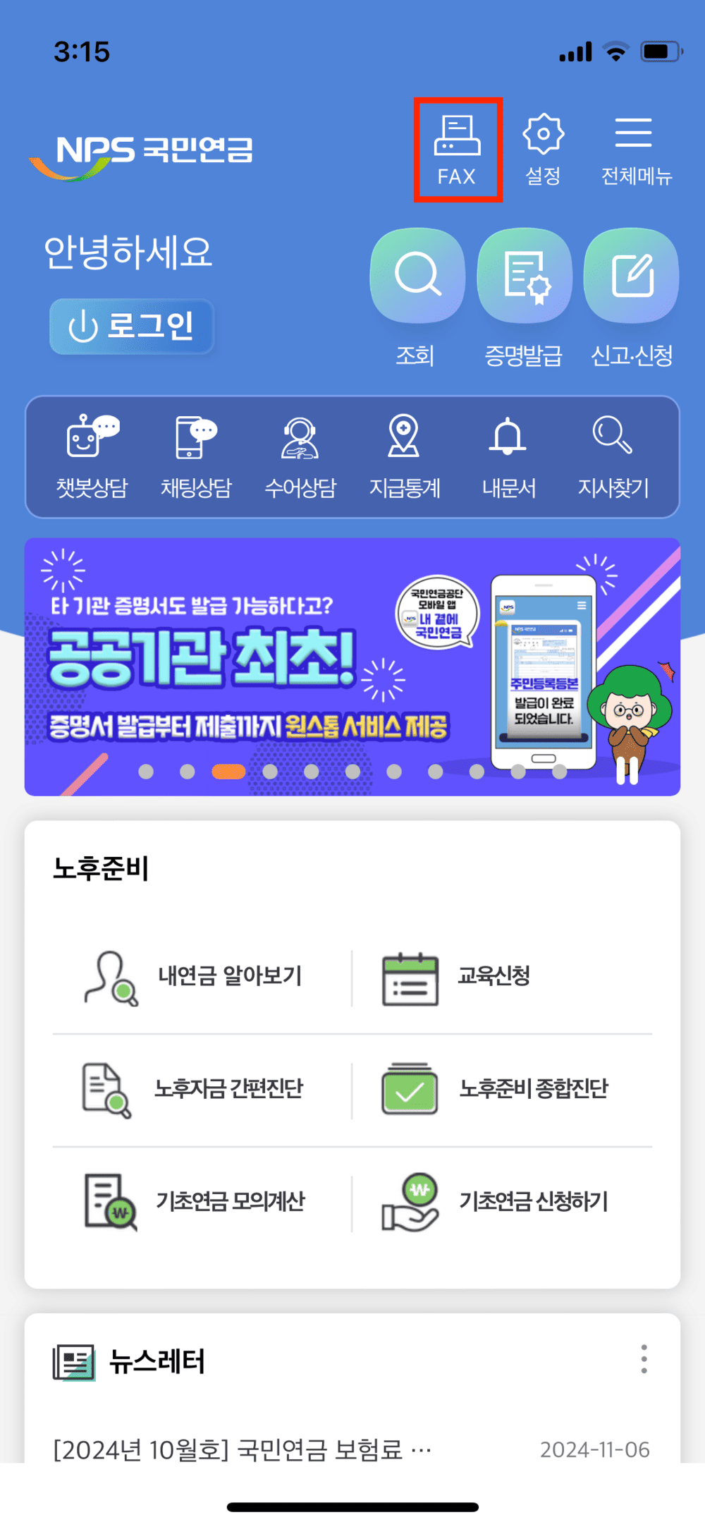 설치완료 후 어플에 접속해 보면 상단에 FAX라는 아이콘이 보일 텐데요. 해당 아이콘을 클릭해 보면 어플로 이미지를 팩스로 보낼 수 있게 되어 있어요.