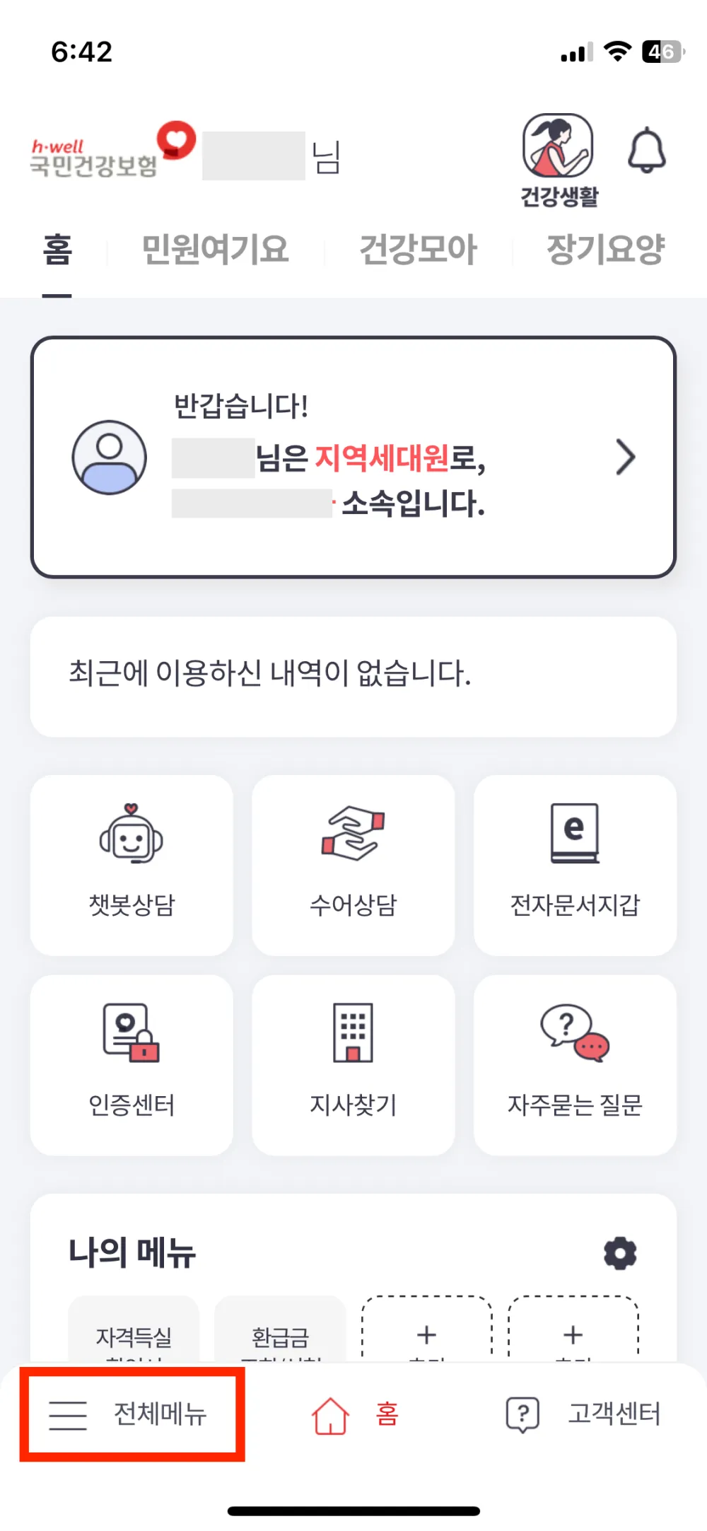 로그인 후 어플 하단 왼쪽의 '전체메뉴'를 클릭해 주세요. 메뉴 중 [건강모아> 전년도미수검자 추가신청]으로 들어가 주세요.