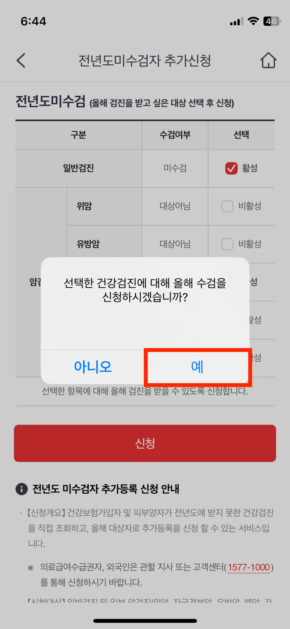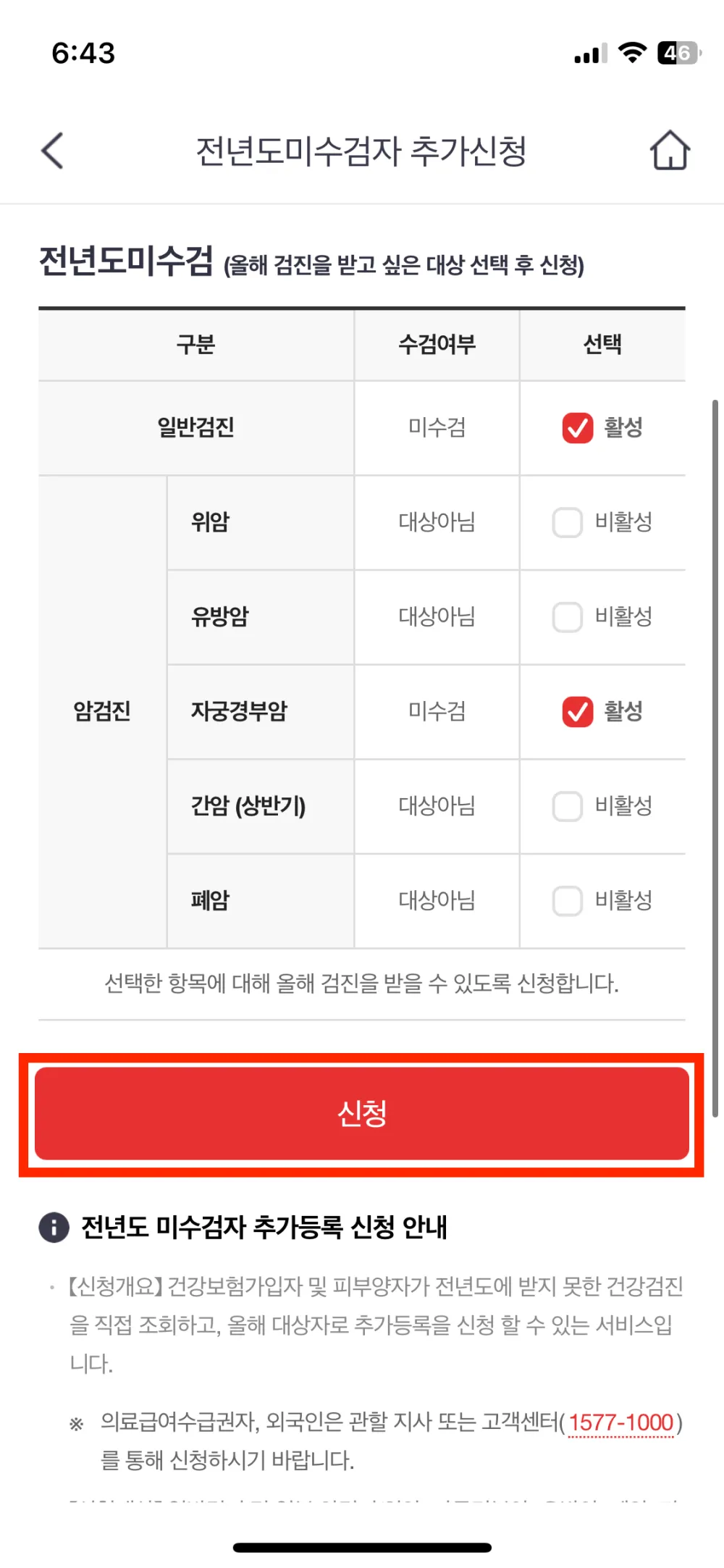전년도에 검사받지 않은 항목들이 활성화되어 있는데요. 확인 후 맨 아래의 '신청' 버튼을 클릭해 줍니다.