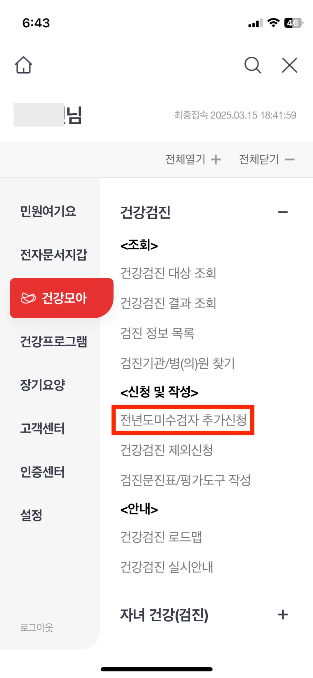 로그인 후 어플 하단 왼쪽의 '전체메뉴'를 클릭해 주세요. 메뉴 중 [건강모아> 전년도미수검자 추가신청]으로 들어가 주세요.
