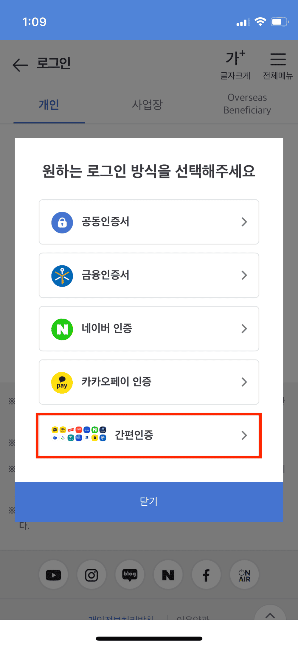 간편 인증 로그인을 클릭하면 다양한 인증서들이 나옵니다. 본인이 편한 것으로 인증해 주세요. 저는 카카오톡 인증서를 주로 쓰기에 카카오톡 선택 후 이름, 생년월일, 휴대폰 번호를 적은 뒤 카카오톡 어플을 통해 인증해 주었습니다.