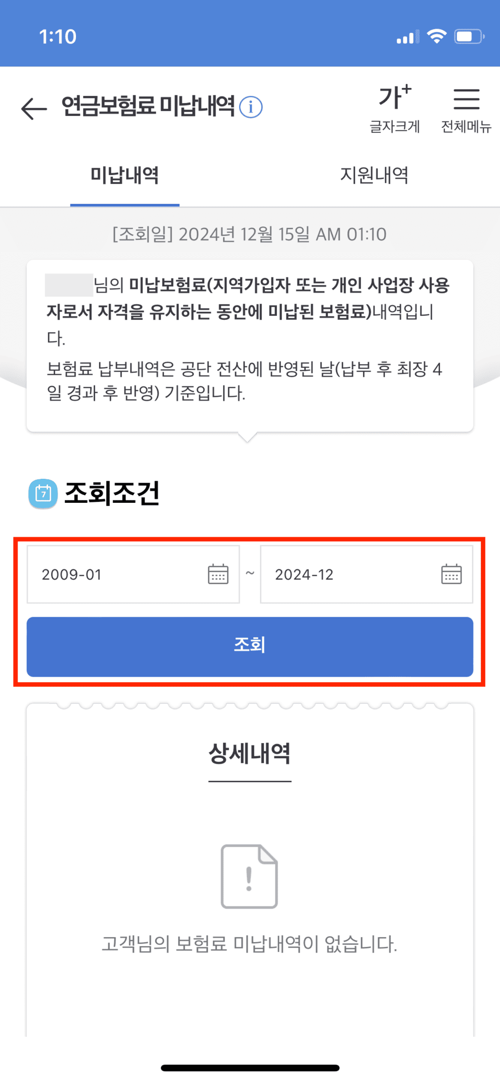 로그인을 완료하면 바로 미납내역을 조회할 수 있는 페이지가 나타납니다. 여기서 조회하고픈 기간을 설정해 준 뒤 '조회' 버튼을 누르면 간편하게 연금보험료 미납내역에 대해 알아보실 수 있습니다.