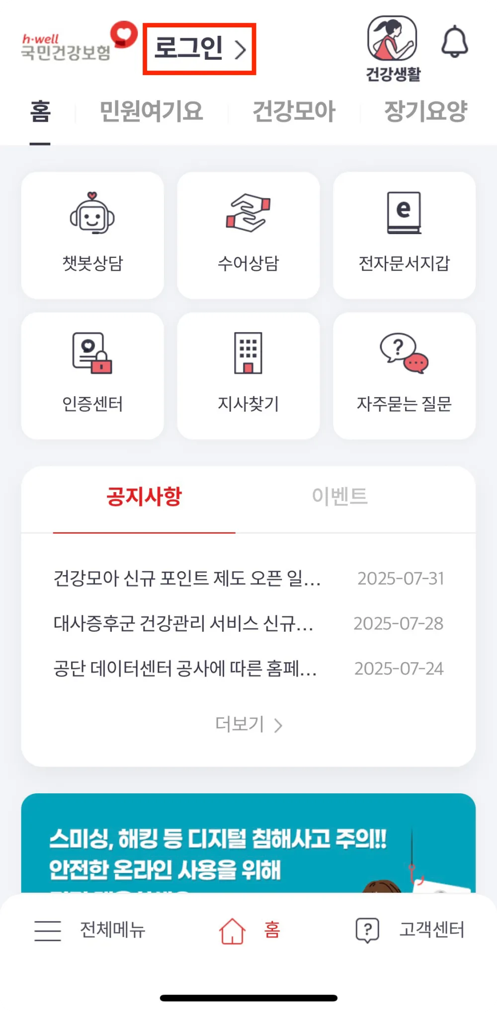 2. 로그인: 건강보험 인증서, 공동인증서, 금융인증서, 간편 인증서