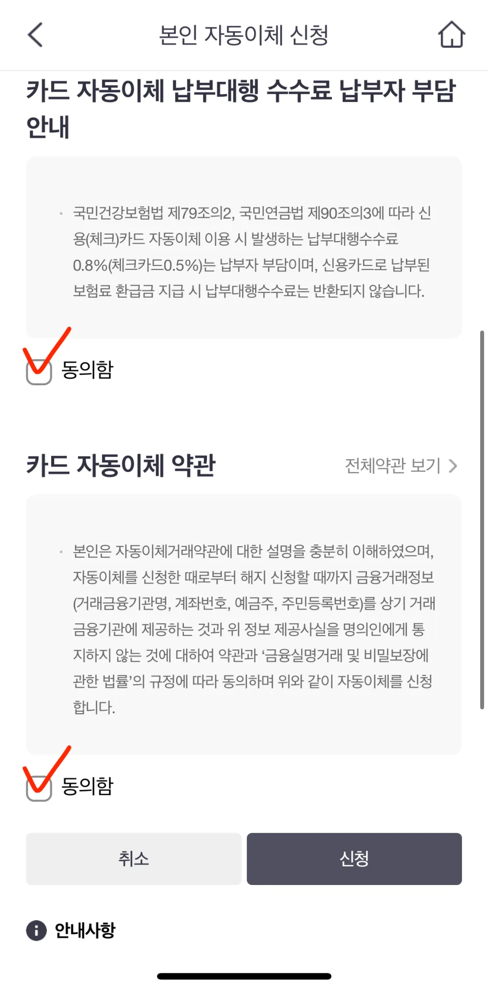 7. 자동이체 수단 체크하고 보험 구분 항목 체크, 이후 자동이체할 계좌나 카드정보 입력