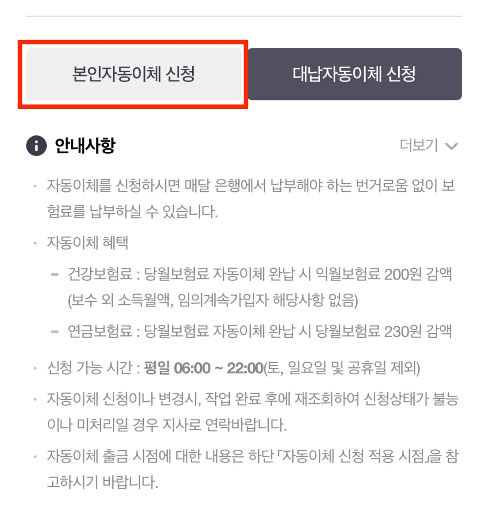 6. 본인의 경우 [본인자동이체 신청], 대납의 경우 [대납자동이체 신청] 클릭