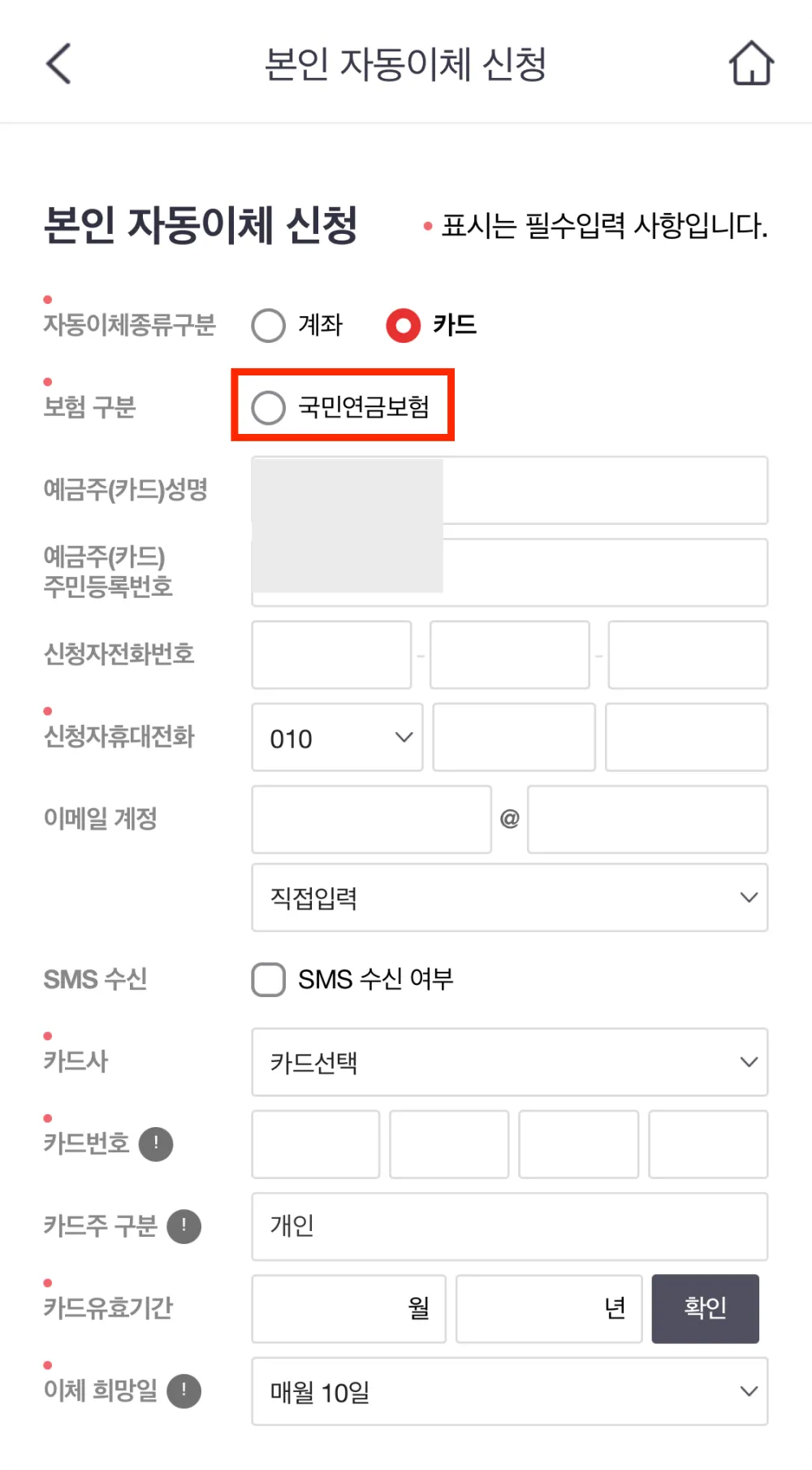 7. 자동이체 수단 체크하고 보험 구분 항목 체크, 이후 자동이체할 계좌나 카드정보 입력