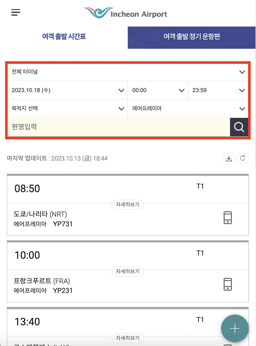 이렇게 인천공항 홈페이지에 접속하면 항공편을 조회할 수 있는 창이 나오며, 본인의 항공편을 검색한 뒤 자세히 보기를 누르면 체크인 카운터뿐만 아니라 최단이동경로, 탑승구 등의 정보를 바로 확인하실 수 있습니다.