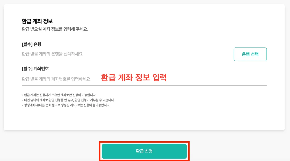 환급 대상자로 선정되었을 때 환급받을 계좌 정보를 입력해 주세요. 이후 [환급 신청]을 클릭해 주세요.