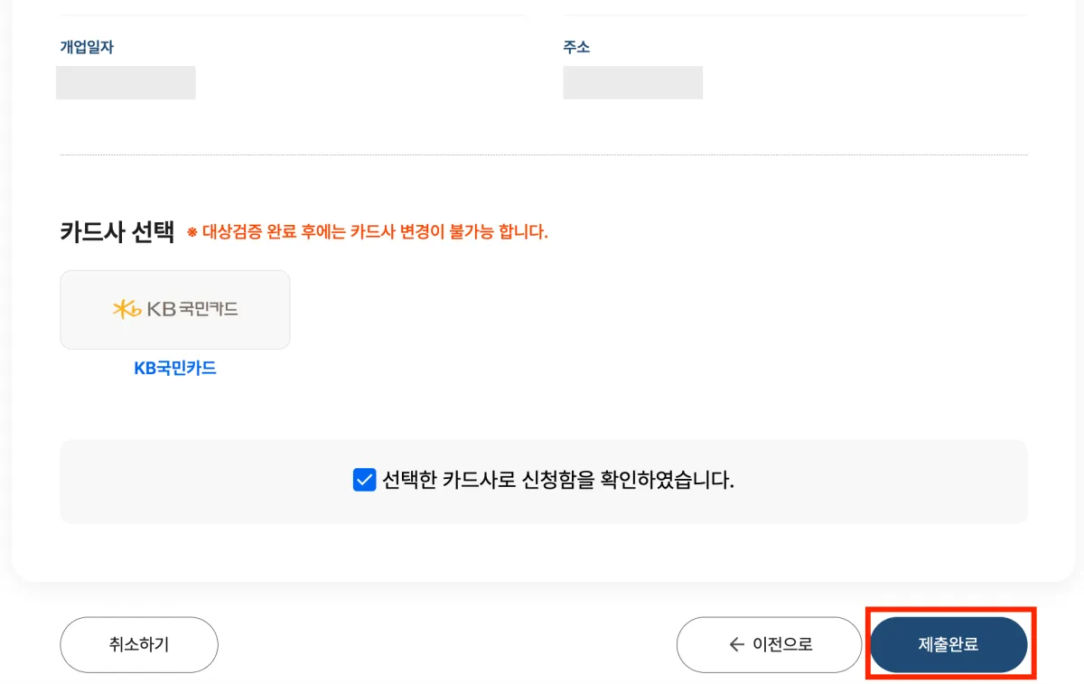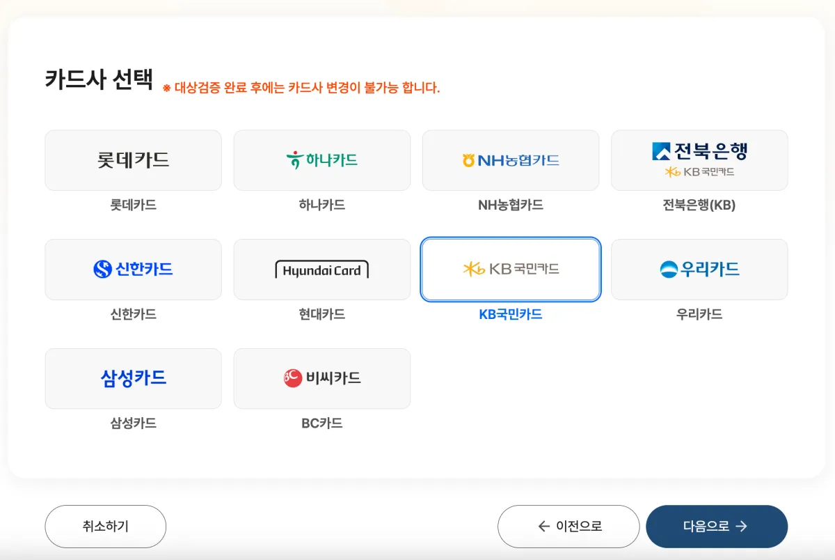2. 크레딧을 받을 원하시는 카드사를 선택해 주세요. 대상검증 완료 후에는 카드사 변경이 불가능하기 때문에 현재 본인이 공과금을 납부하고 있는 카드사가 어디인지 확실히 확인하시고 선택해 주세요!
