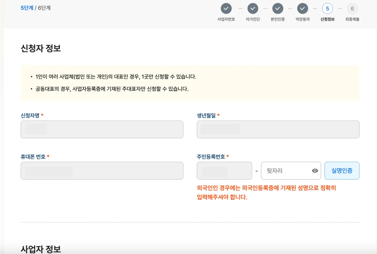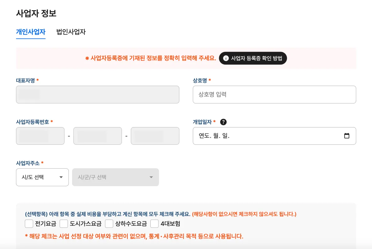 7. 본인의 주민번호 뒷자리를 입력해 실명 인증을 한 뒤 상호명, 개업일자, 사업자 주소의 정보를 입력합니다.
