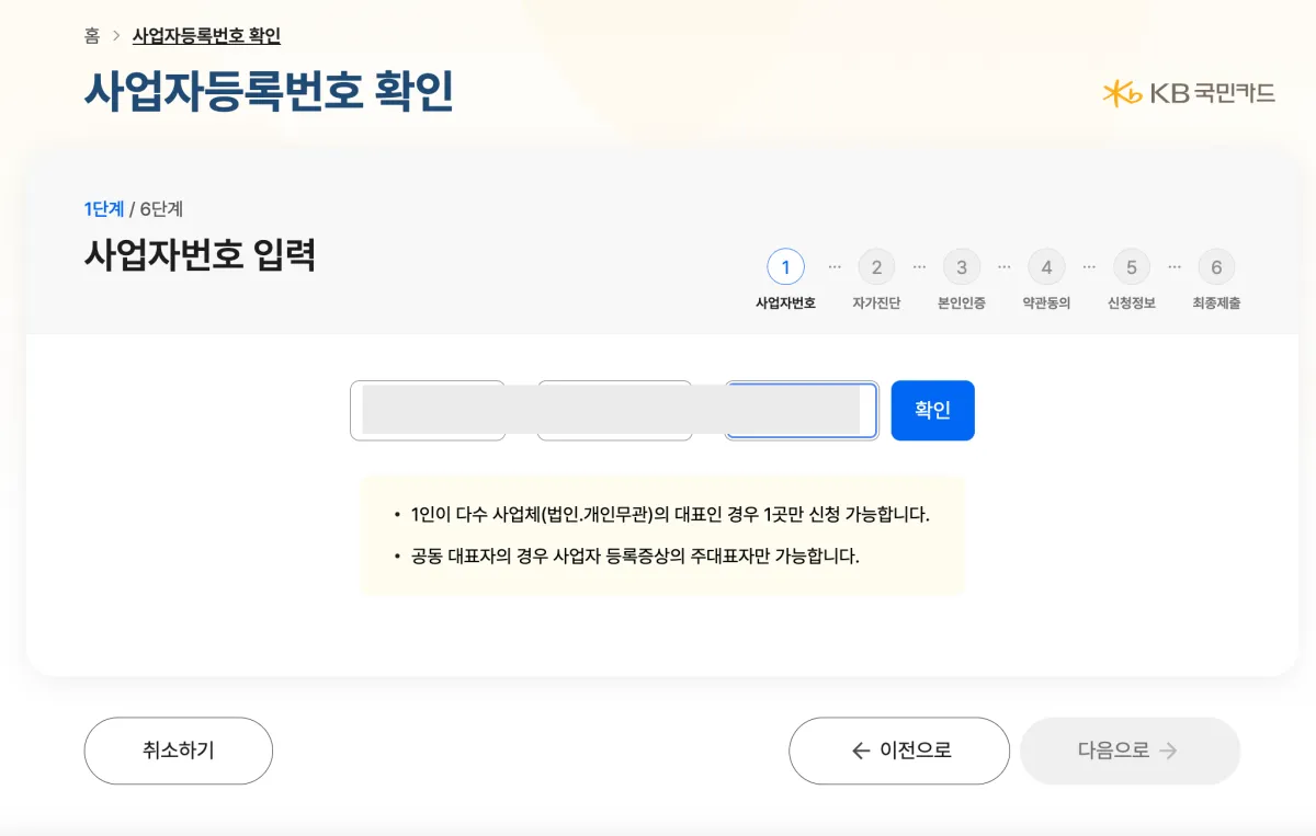 3. 본인의 사업자 번호를 입력 후 확인을 누르고 다음으로 넘어가 주세요.