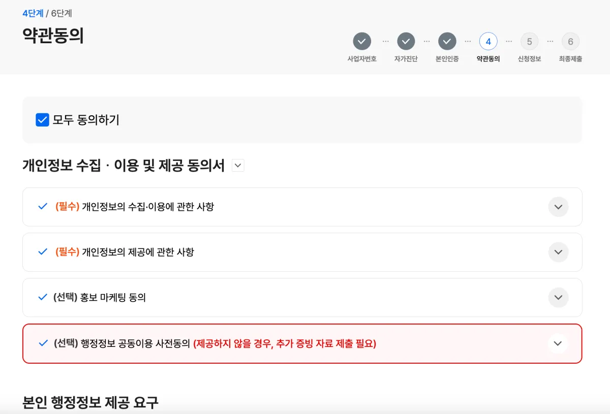 6. 약관 읽어보시고 추가로 입력이 필요한 부분에 입력한 뒤 동의 후 다음 단계로 넘어가 주세요.