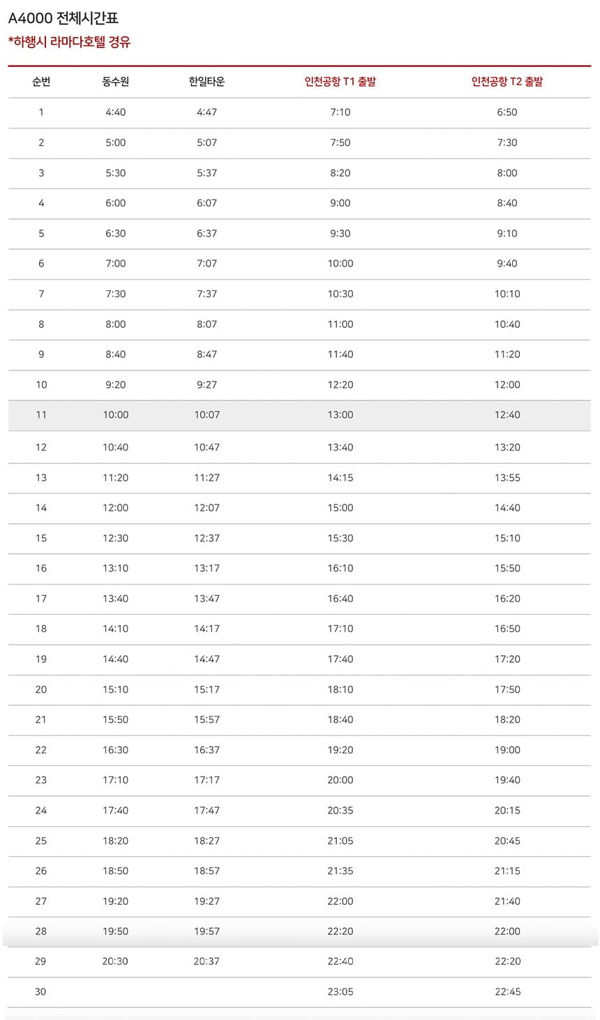 4000번 공항버스 동수원 ↔︎ 인천공항 전체 시간표