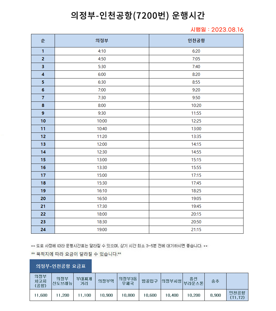 의정부에서 인천공항 가는 법, 7200번 버스 시간표, 첫차 막차 시간, 요금