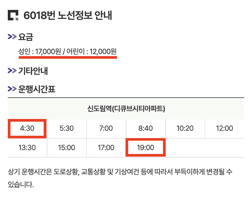 *도로 교통 상황에 따라 버스가 빠르게 혹은 늦게 도착할 수 있으니 항상 미리 도착해 있는 것을 권장드립니다.