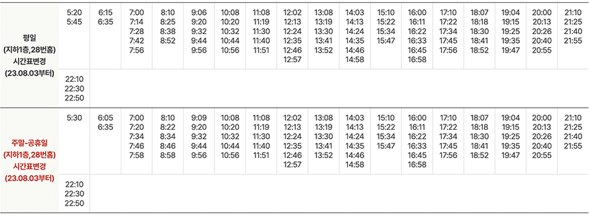 인천공항에서 출발하는 경우 시간표 및 탑승 위치