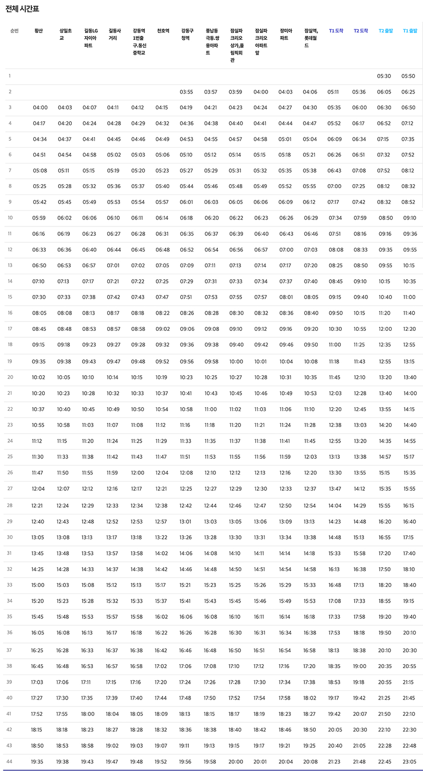 첫차를 기준으로 4시에 황산에서 출발한 버스는 제1터미널에 약 5시 35분에, 제2터미널에는 약 6시에 도착하게 됩니다. 위 표를 참고하시면 인천공항에서 출발하는 시간대도 알아보실 수 있습니다.